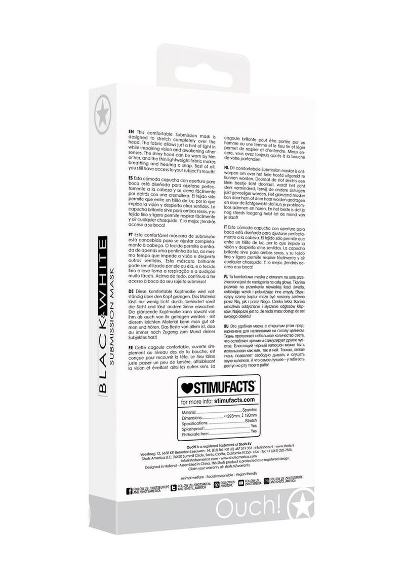 This comfortable Submission mask is designed to stretch completely over the head. The fabric allows just a hint of light in while impairing vision and awakening other senses. The shiny hood can be worn by him or her, and the thin lightweight fabric makes breathing and hearing a snap. Best of all, you still have access to your subject's mouth!