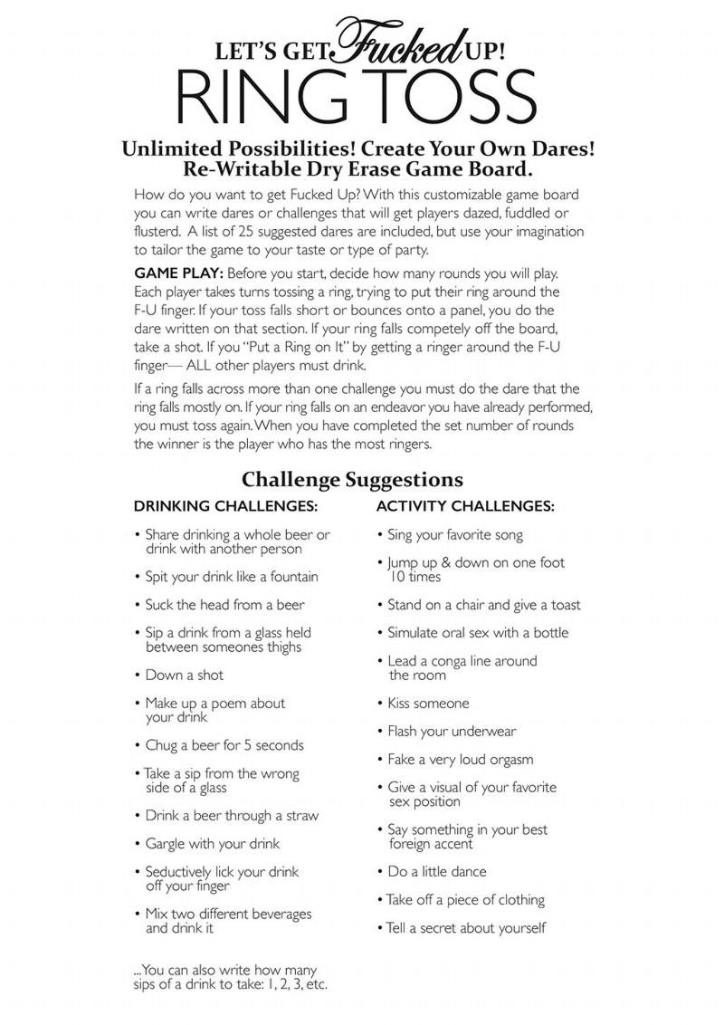 Letb s Get Fucked Up Ring Toss is a hilarious fast paced party game with endless possibilities and fun! Included in the box is the opportunity to create your own dares with the included dry erase marker or use the included sheet of dares and challenges. With limited game pieces players are invited to create their own game play and rules! The heavyweight gold F-U finger is impressively crafted and makes a great centerpiece for this game that tests your skill and senses! Letb s get Fucked up Ring Toss game is one of our many fine drinking games and icebreakers by Little Genie and Candyprints.