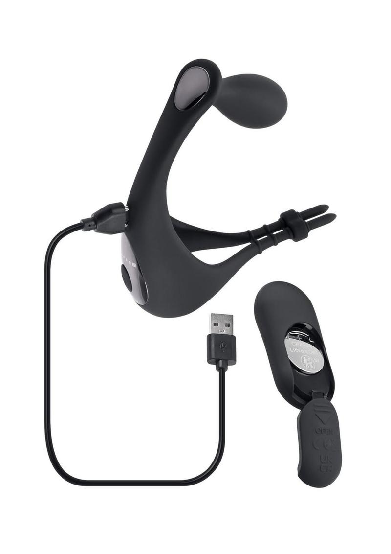 This unique remote vibrating plug and ring combo features two powerful motors that work together in the shaft and base. The adjustable C-ring arms offer 3 distinct positions while the bulbous plug tapers at the top and bottom with a safety base that connects to form one smooth flexible shape.