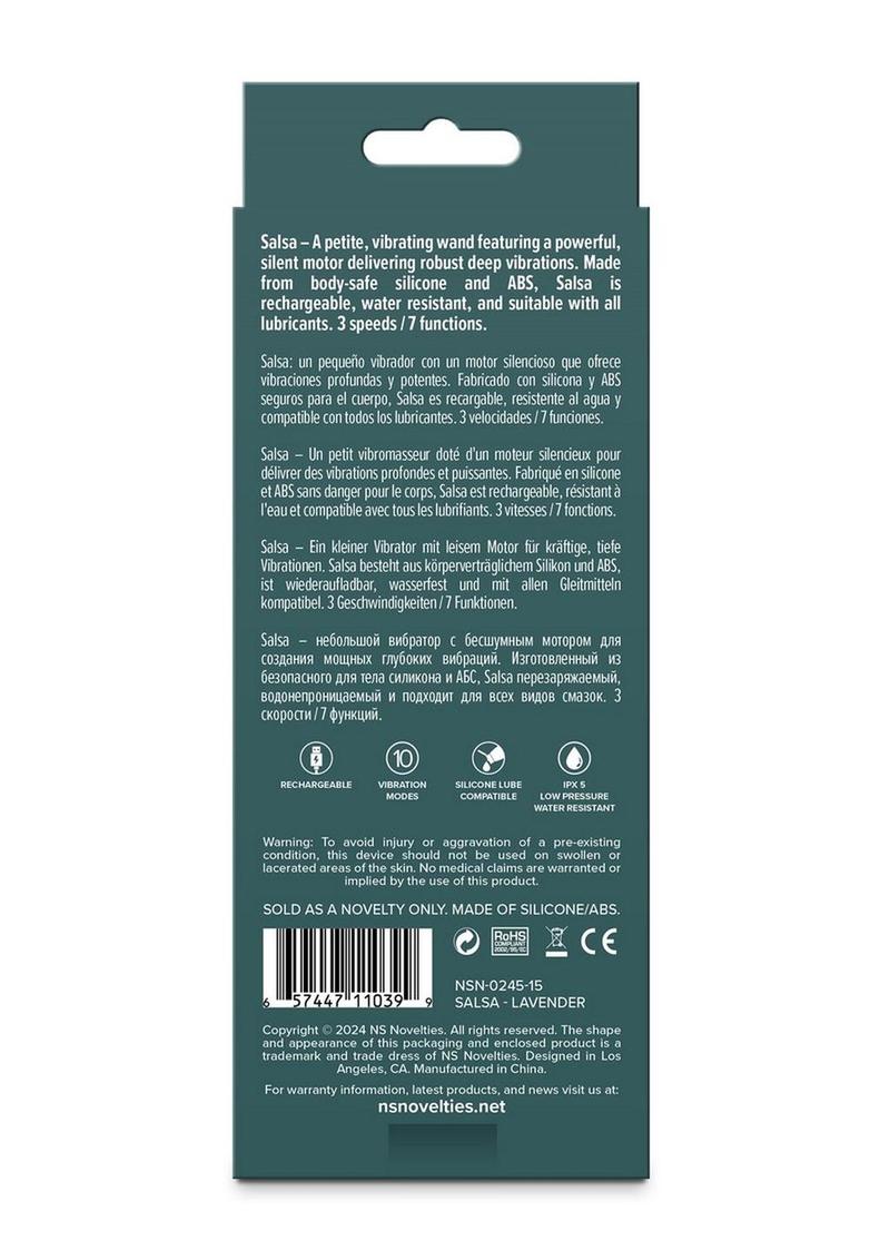 Salsa b A petite, vibrating wand featuring a powerful, silent motor delivering robust deep vibrations. Made from body-safe silicone and ABS, Salsa is rechargeable, water resistant, and is suitable for use with all lubricants including silicone lubricant. 3 speeds / 7 functions IPX5 waterproof rating.